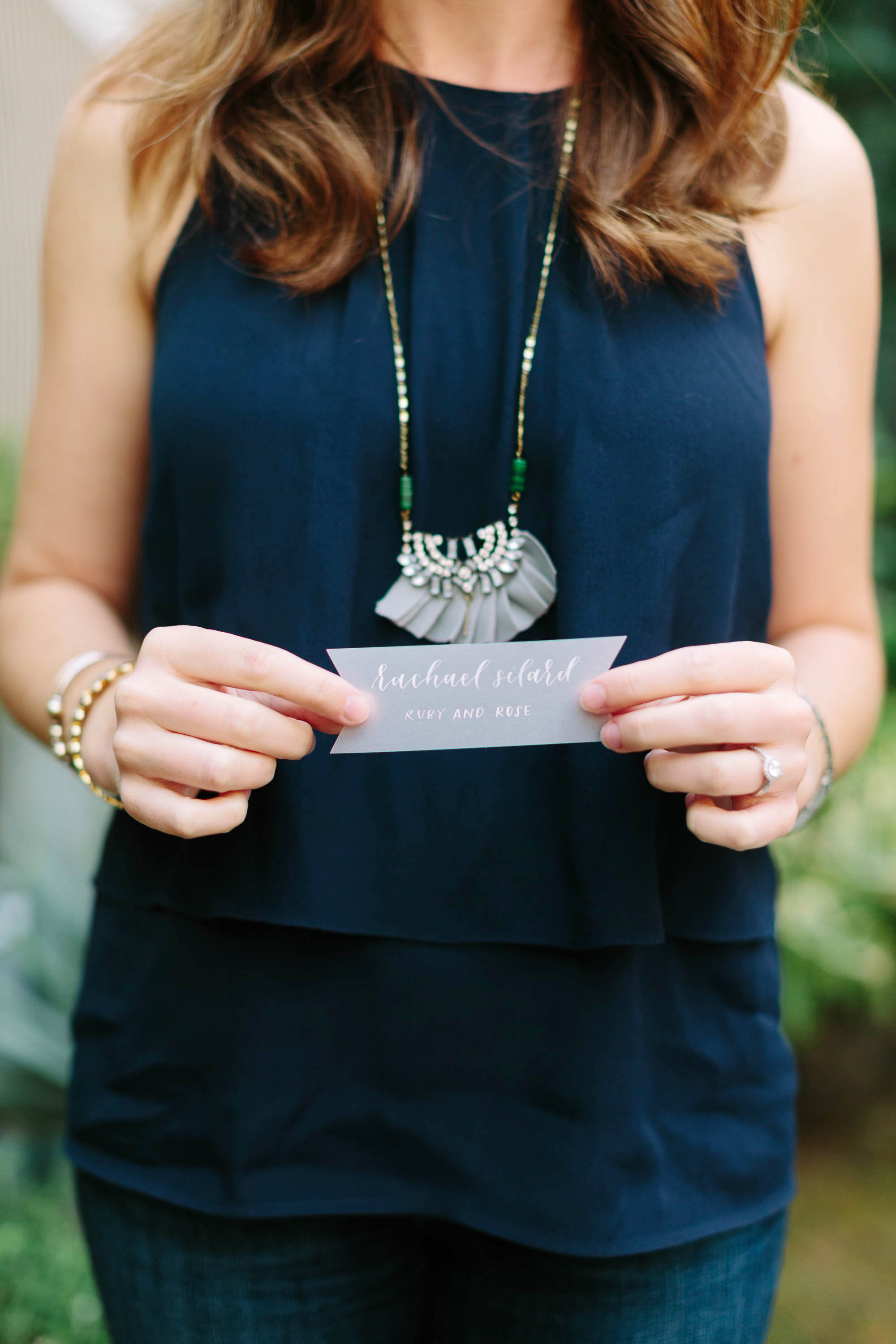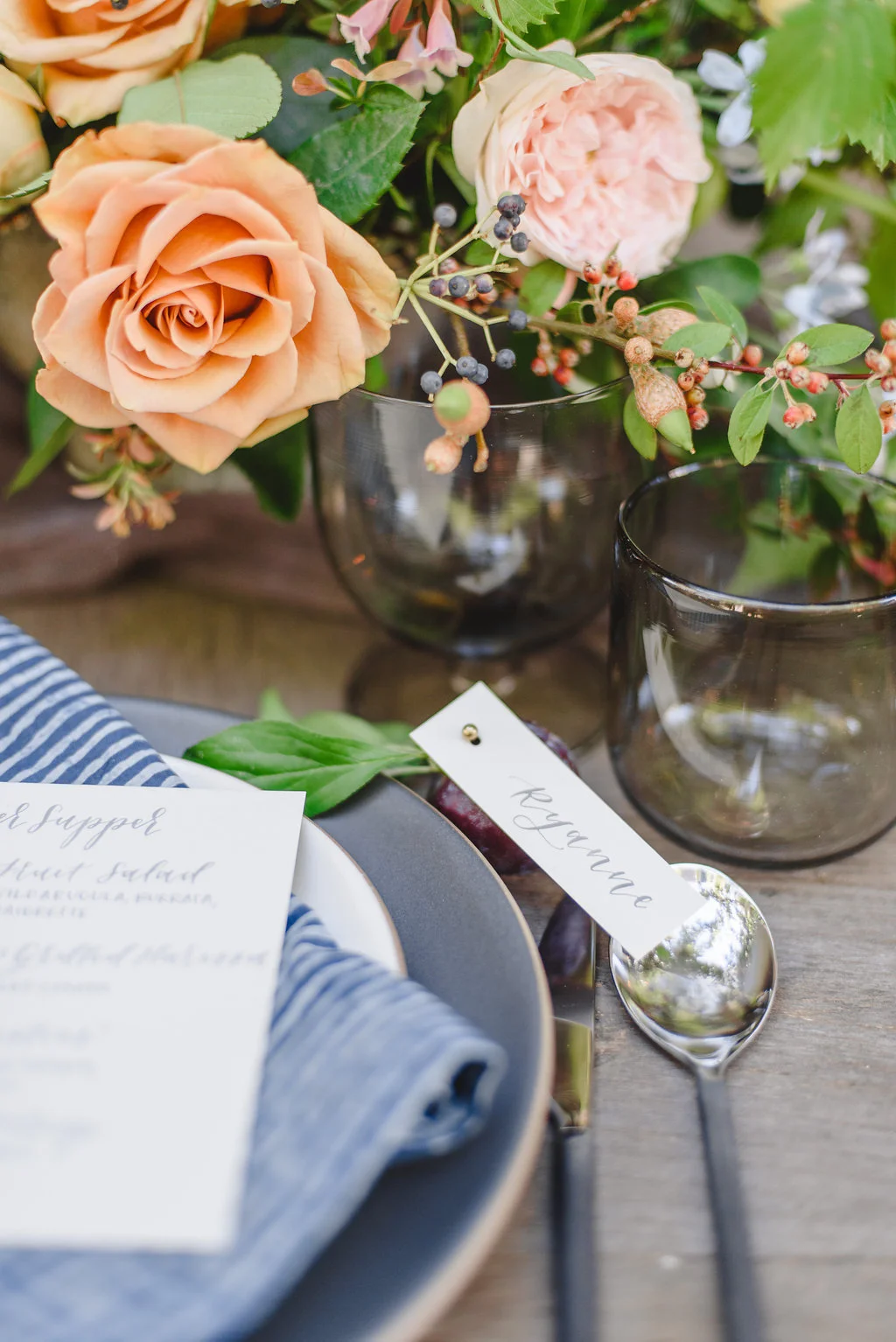 Beautiful paper goods - another one of my favorite things. Including a simple menu at each person's place setting makes any meal that much more special and builds anticipation for the delicious food you're about to have. Bri of Brown Fox Calligraphy hand-wrote these menus in a medium-gray ink on light-gray paper. Of course, for a larger event, hand-written menus for each guest might not be practical, but when you're only setting a table for 8 this is a worthy splurge! We made each place setting extra special by attaching each person's place card to a sweet little plum.