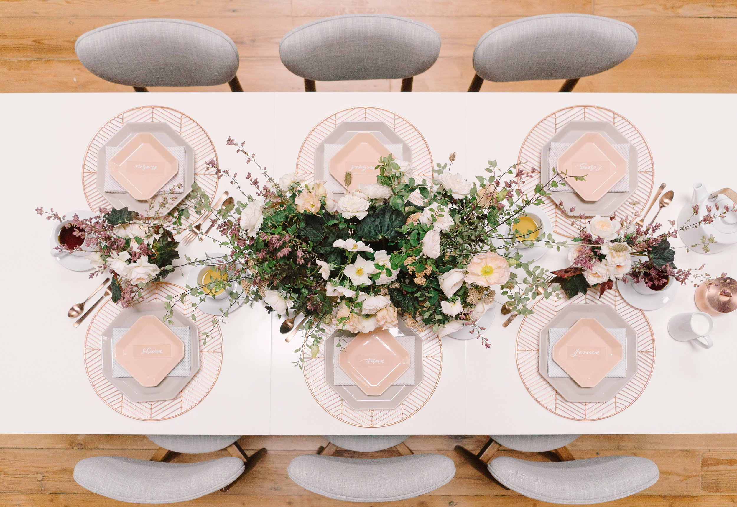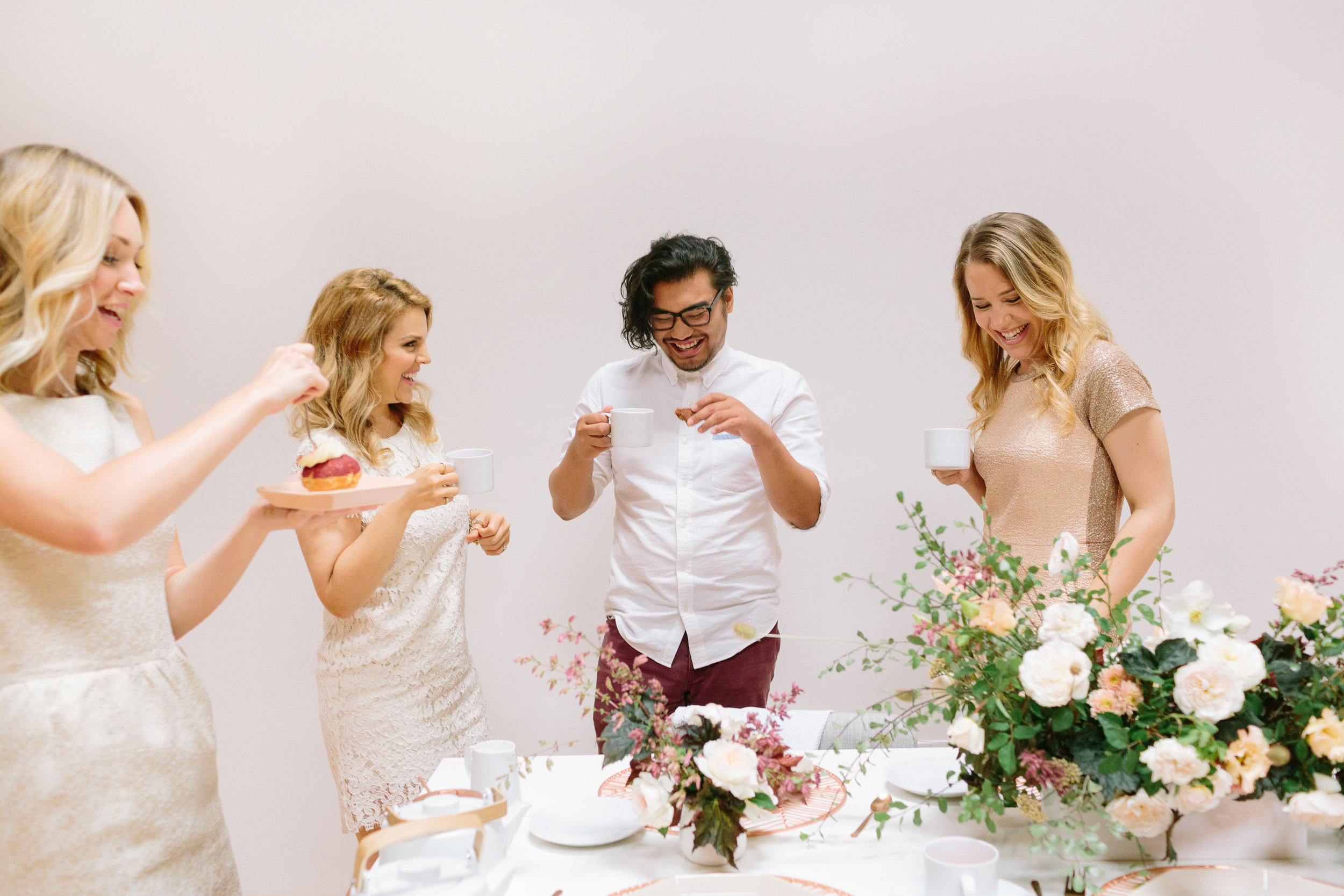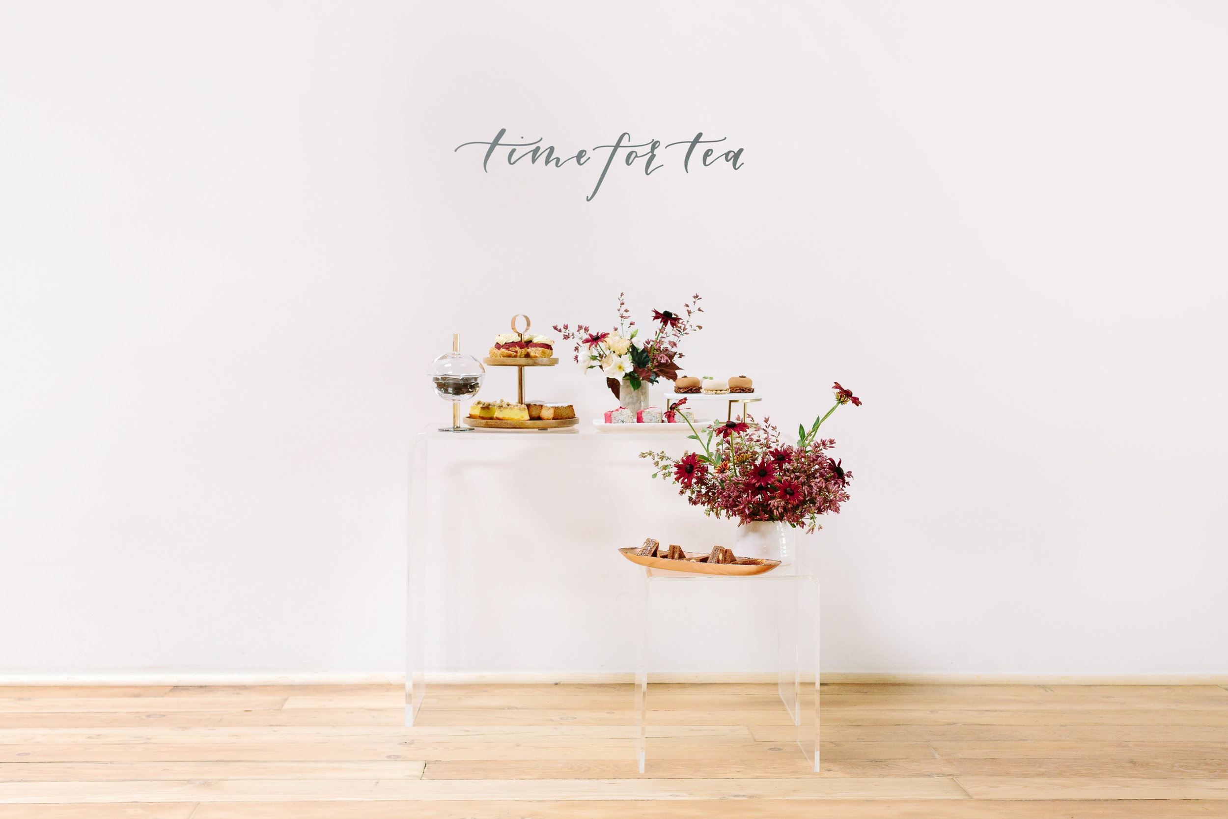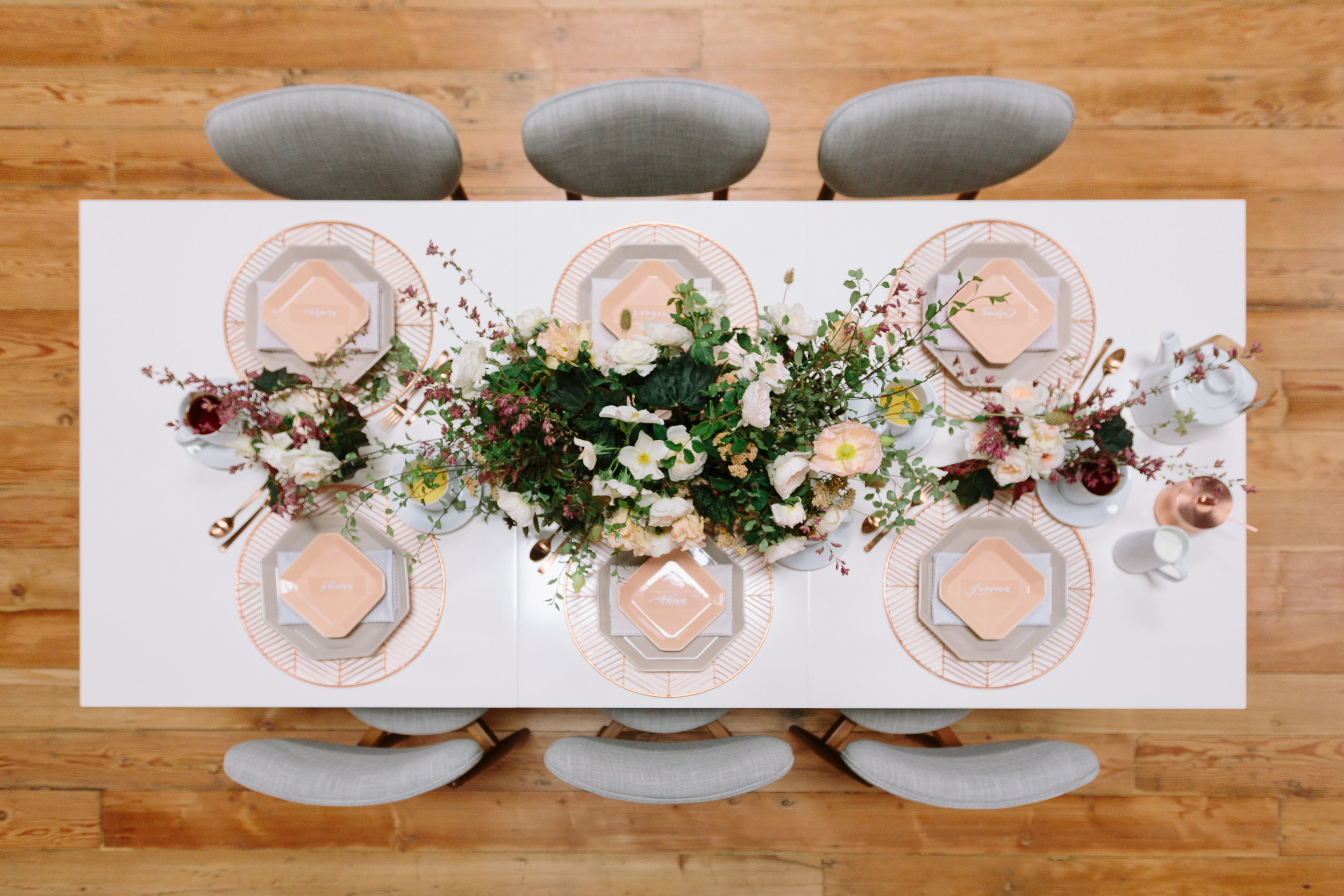 Of course for me, apart from the tea itself, I was most excited about designing a tablescape that was beautiful and unusual. I decided to go with a mid-century influence to bring in a modern vibe and then soften it with florals. I must have had 20 conversations with Melanie Tom of Hawthorn Flower Studio to try and describe what I wanted...I could see it in my head but it was difficult to communicate! But she read my mind and came up with the most gorgeous floral design that was both organic yet structured, romantic but not overly feminine, and had this amazing movement that filled up the negative space in the most incredible way. All the heart eyes.