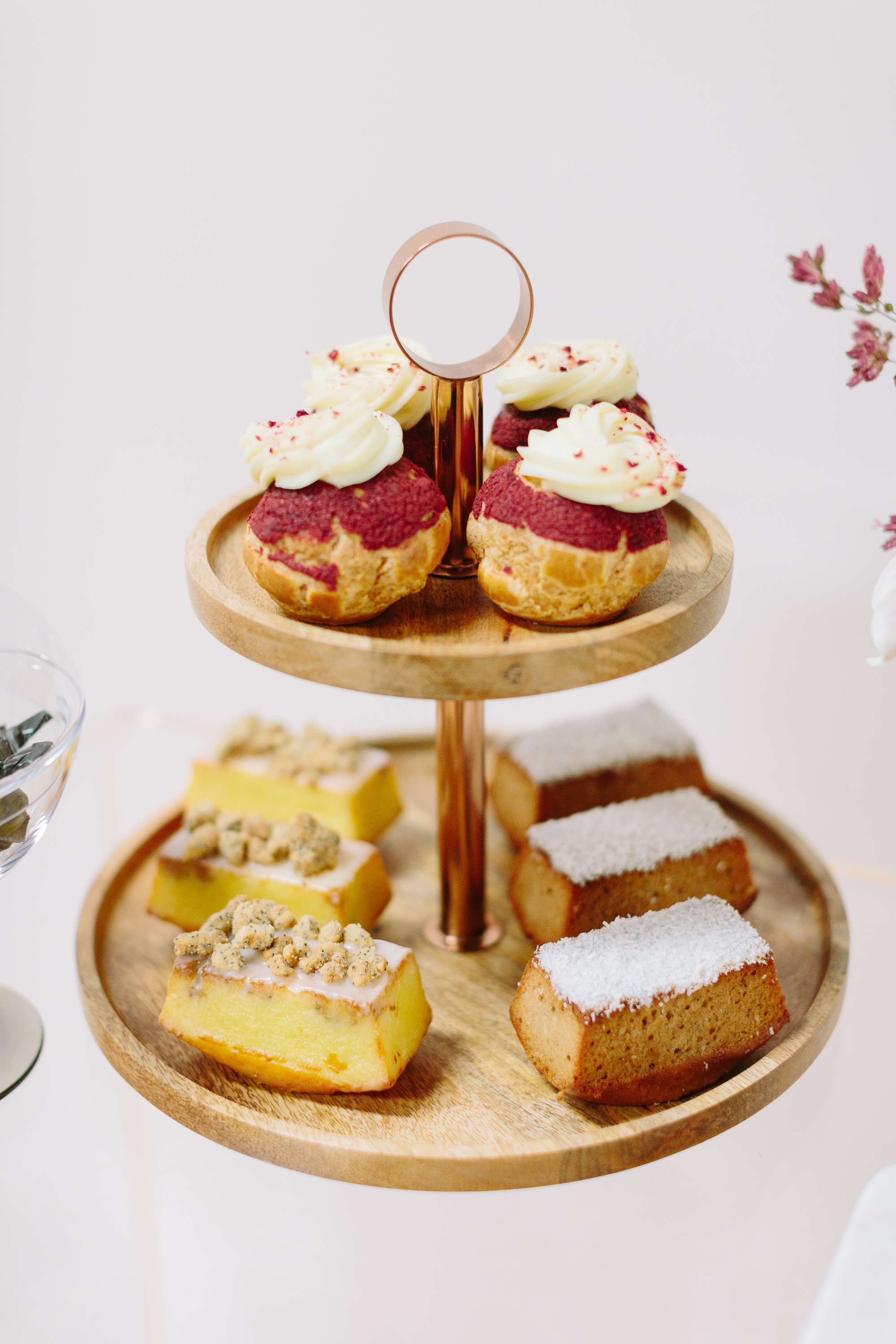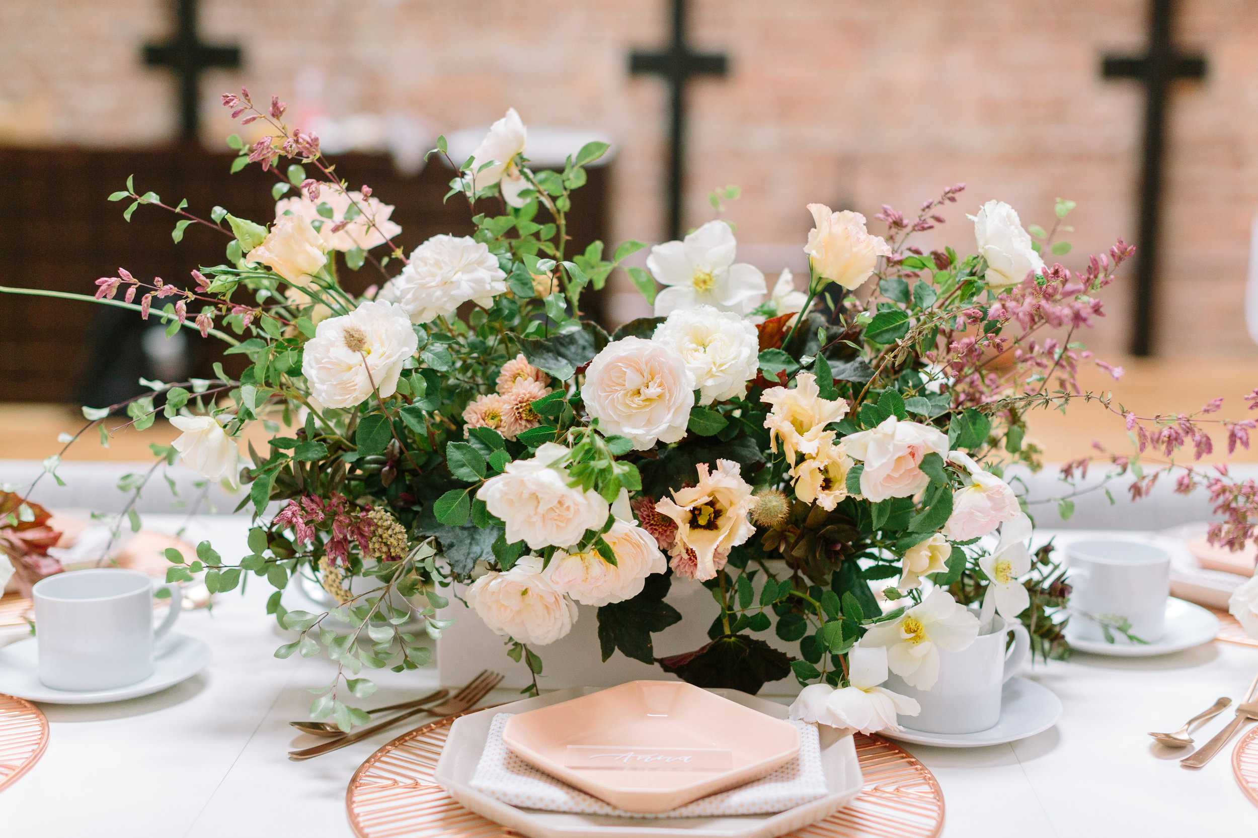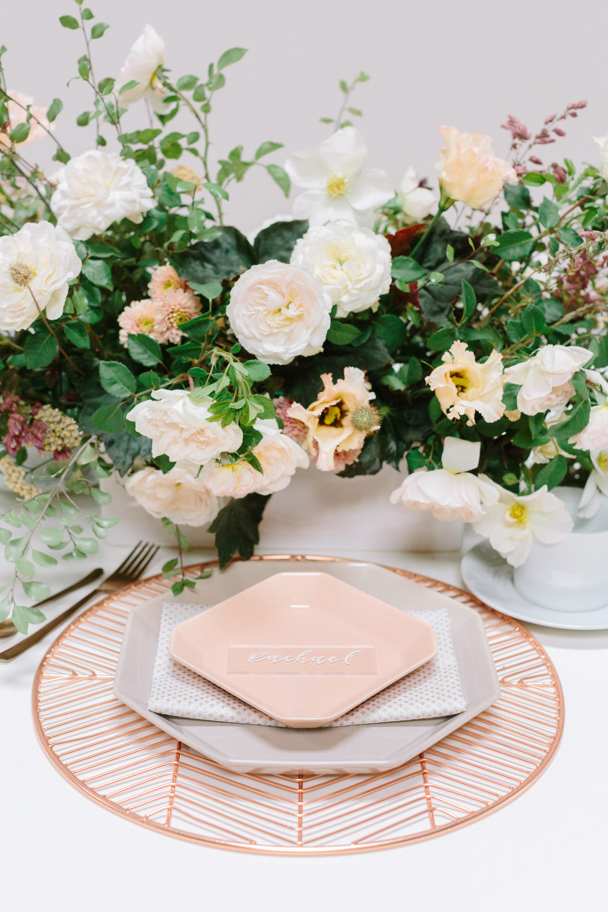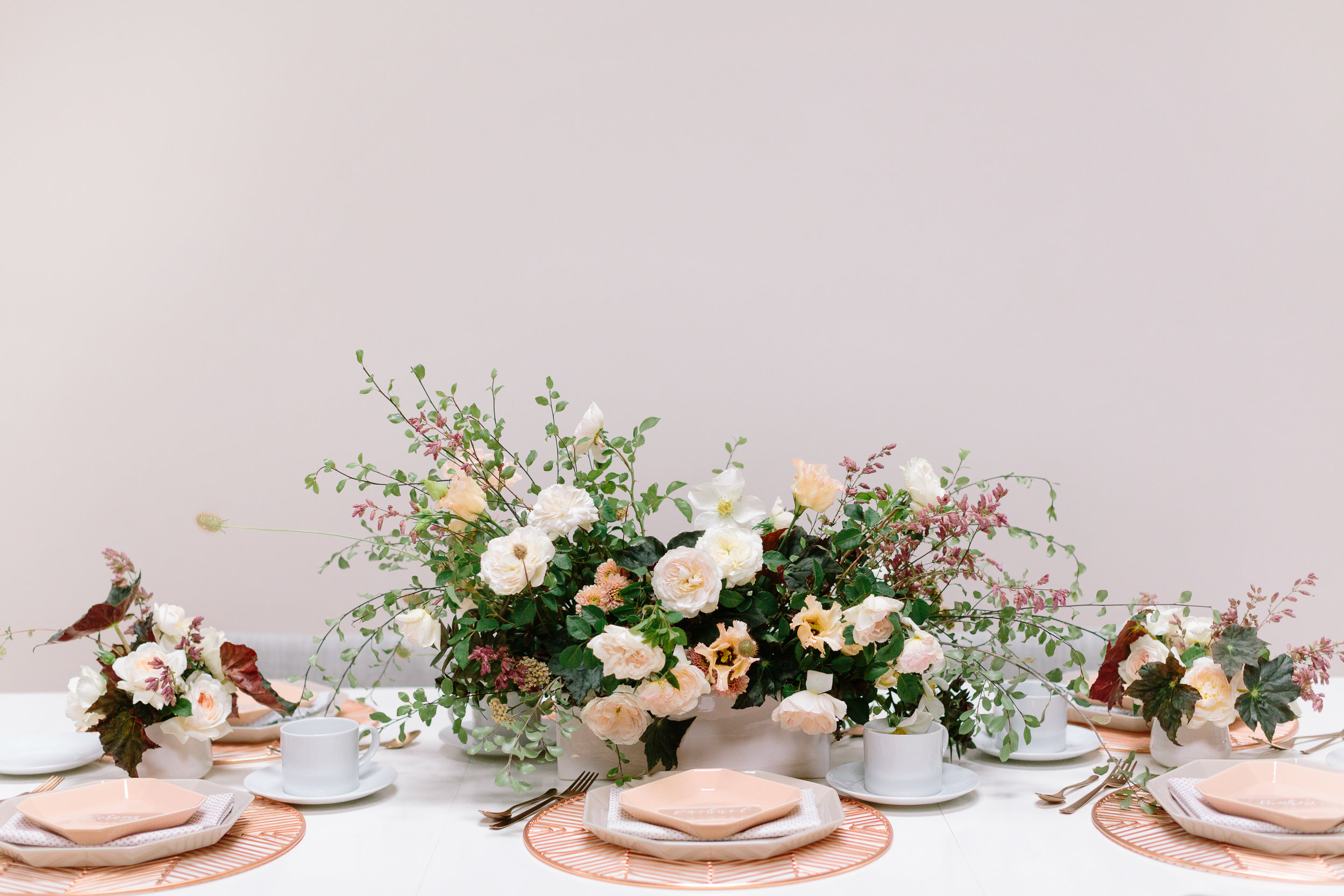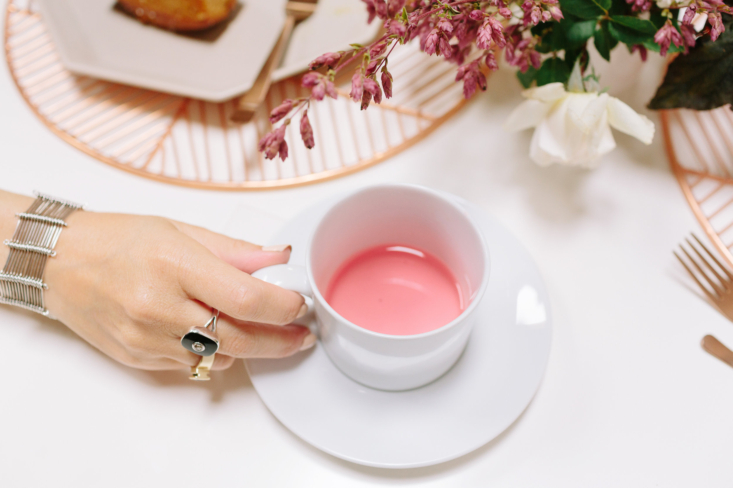 Of course for me, apart from the tea itself, I was most excited about designing a tablescape that was beautiful and unusual. I decided to go with a mid-century influence to bring in a modern vibe and then soften it with florals. I must have had 20 conversations with Melanie Tom of Hawthorn Flower Studio to try and describe what I wanted...I could see it in my head but it was difficult to communicate! But she read my mind and came up with the most gorgeous floral design that was both organic yet structured, romantic but not overly feminine, and had this amazing movement that filled up the negative space in the most incredible way. All the heart eyes.
