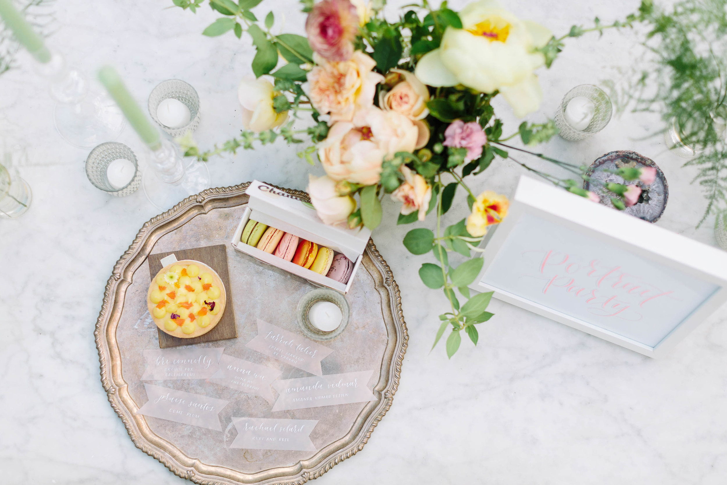 Naturally, one needs to be properly invited to a tea party, and I loved Bri Connolly of Brown Fox Calligraphy's modern take on this invitation suite. This was the first time I'd had a chance to design something on acrylic, and though a bit finicky to work with, it's such a fun material. Especially when you have Bri's gorgeous handwriting overlaid on top.